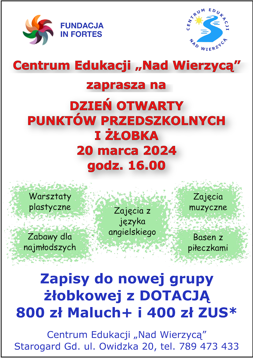 Fundacja In Fortes otrzymała dofinansowanie w ramach Resortowego programu rozwoju instytucji opieki nad dziećmi w wieku do lat 3 „MALUCH +” 2021 z przeznaczeniem na utworzenie i zapewnienie funkcjonowania miejsc opieki nad dziećmi w wieku do lat 3, w Klubie Dziecięcym „Nad Wierzycą” w Starogardzie Gdańskim przy ul. Owidzkiej 20.